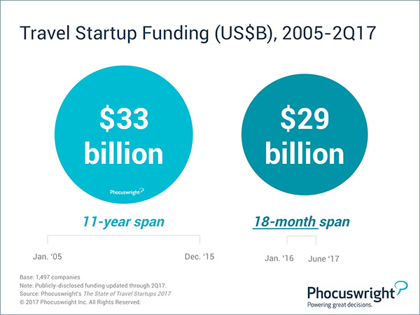 The forthcoming Phocuswright report, The State of Travel Startups 2017, highlights the astonishing influx of funding into travel startups over the past year and a half. In the first decade that Phocuswright tracked funding (2005 through 2015), travel startups attracted US$33 billion in capital. From 2016 through 2Q17 – a period of just 18 months – travel startups raised $29 billion, nearly doubling the total amount raised since 2015 to $62 billion.