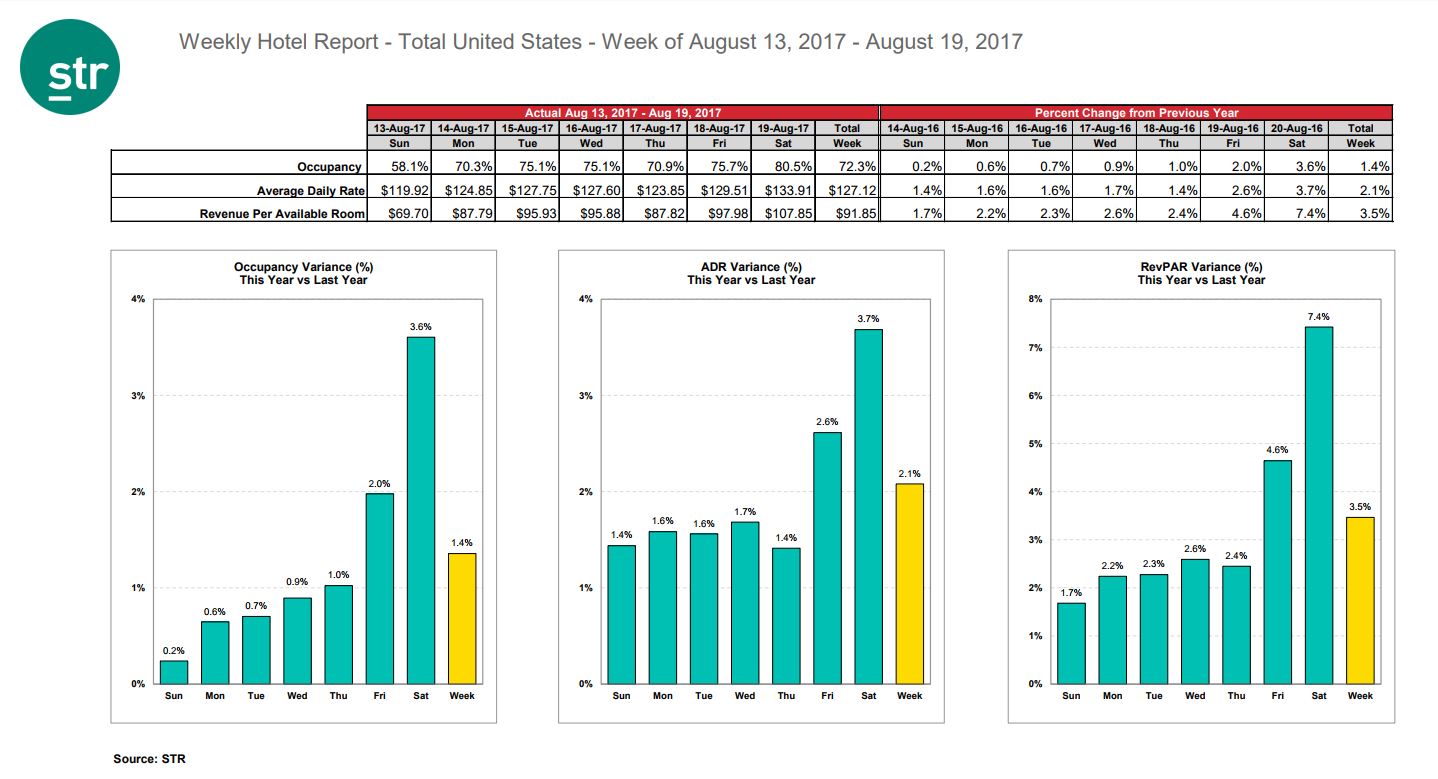 HENDERSONVILLE, Tennessee – The U.S. hotel industry reported positive year-over-year results in the three key performance metrics during the week of 13-19 August 2017, according to data from STR.