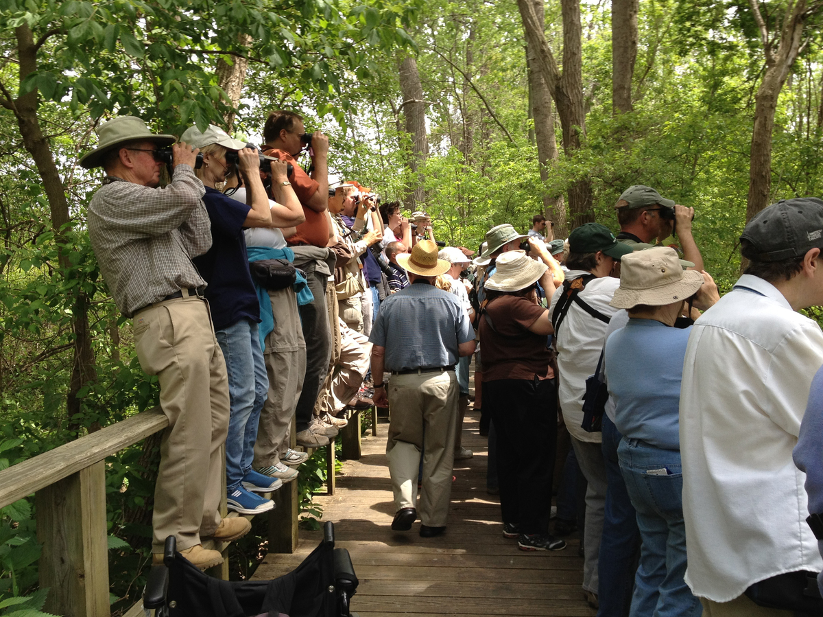 Birders at the Magee Marsh Wildlife Area crowd around to look for a bird. Courtesy of Laura Keene hide caption