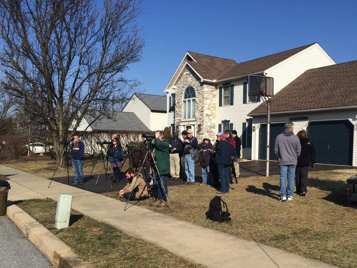 A group of birders wait for a black-backed oriole in a neighborhood in Berks County, Pa., in February. Courtesy of Laura Keene hide caption