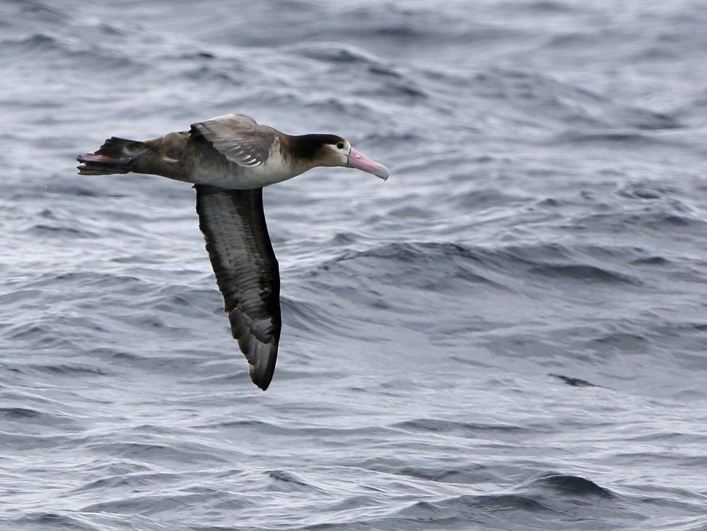 A short-tailed albatross flies between Alaskan islands in May 2016. Courtesy of Laura Keene hide caption