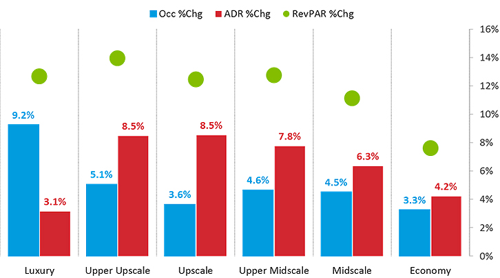 Performance increases were seen across all London submarkets, with the highest levels in the London West End, Earls Court/Kensington/Chelsea and South Central London. At the class level, performance growth was highest for the Upper Upscale (RevPAR: +14.0%) segment.