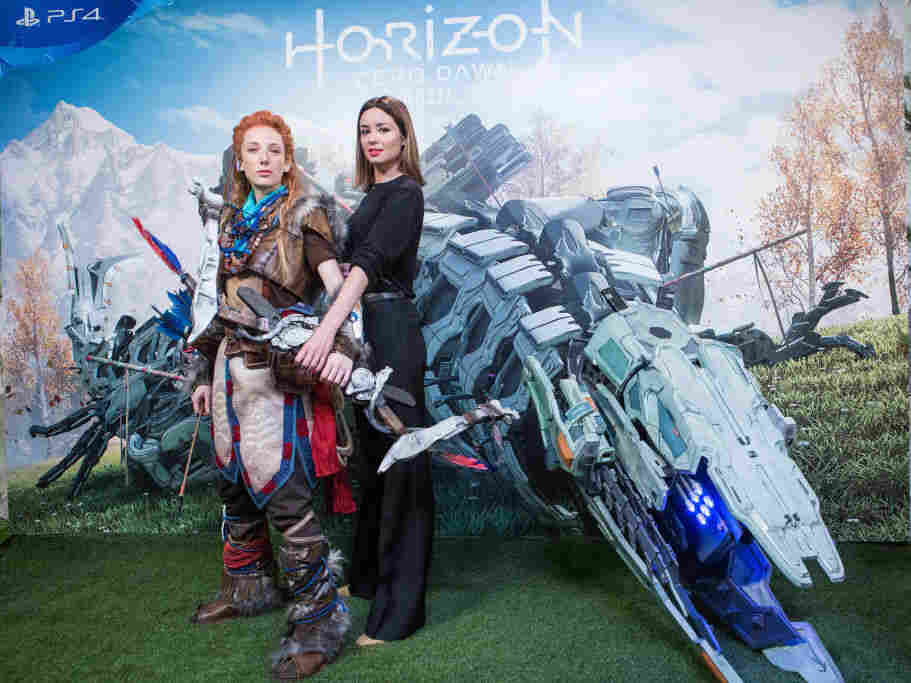 Cosplayer dressed as Aloy (left) and Spanish actress Dafne Fernandez present the “Horizon: Zero Dawn” video game on Feb. 15 in Madrid, Spain. Pablo Cuadra/Getty Images hide caption