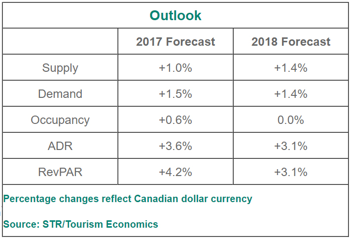 Canada reported a 5.5% increase (Canadian dollars) in revenue per available room during the first quarter of 2017. Growth was driven equally by occupancy (+2.7%) and average daily rate (+2.7%). For the remainder of the year, STR and Tourism economics project RevPAR increases of 5.0% (Q2), 2.7% (Q3) and 4.2% (Q4).