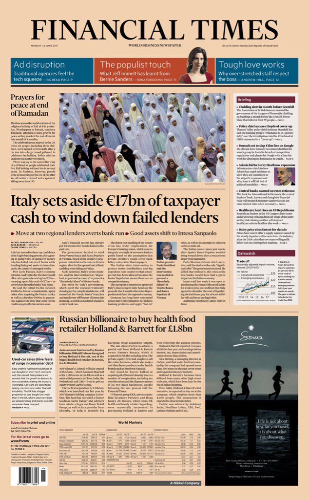 (@AllieHBNews)Monday’s FT: “Italy sets aside €17bn of taxpayer cash to wind down failed lenders” #bbcpapers #tomorrowspaperstoday pic.twitter.com/yCLPJAweiD