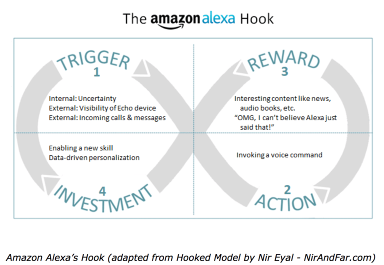 Hooks, according to Nir Eyal, author of Hooked: How to Build Habit-Forming Products, are “experiences designed to connect the user’s problem with the company’s product with enough frequency to form a habit.” In his bestselling book, Eyal describes the four steps of the Hooked Model and provides case studies for how the stickiest technologies use hooks to keep users coming back. In this essay, I’ll use the Hooked Model to help explain how voice assistants, like Amazon’s Alexa, keep us hooked.