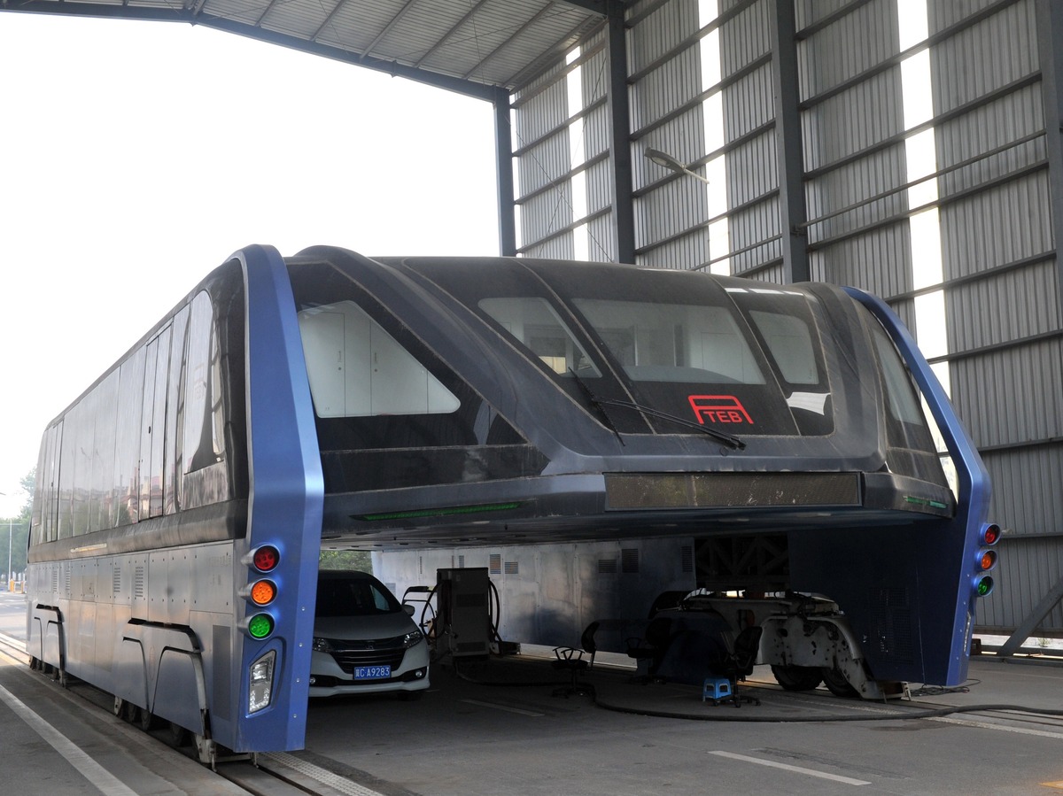 Dubbed the Transit Elevated Bus, the vehicle looks a bit like a catamaran on rails or a bus that straddles two lanes of traffic.