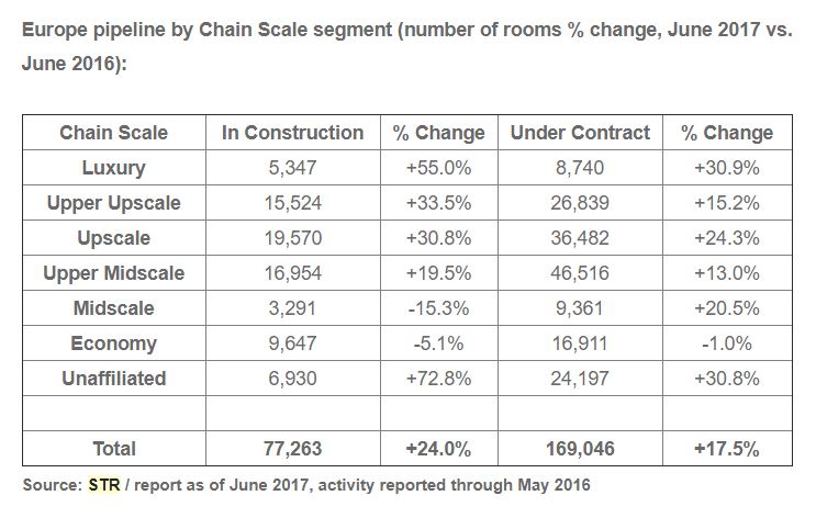 LONDON — STR‘s June 2017 Pipeline Report shows 169,046 rooms in 1,100 hotel projects Under Contract in Europe. The total represents a 17.5% increase in rooms Under Contract compared with June 2016.