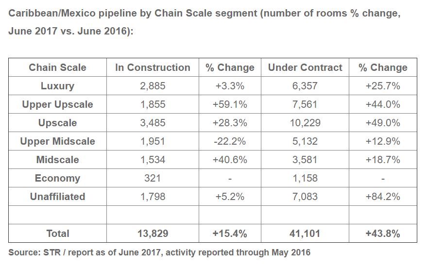 HENDERSONVILLE, Tennessee — STR‘s June 2017 Pipeline Report shows 41,101 rooms in 236 hotel projects Under Contract in the Caribbean/Mexico region. The total represents a 43.8% increase in rooms Under Contract compared with June 2016.