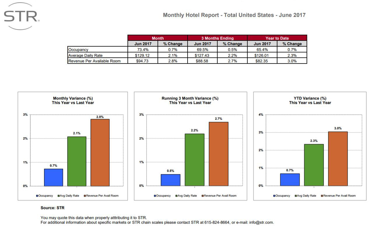 HENDERSONVILLE, Tennessee – The U.S. hotel industry reported positive results in the three key performance metrics during June 2017, according to data from STR.